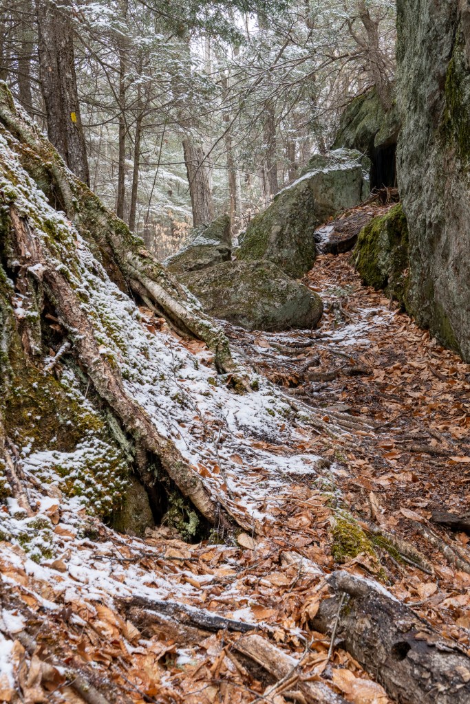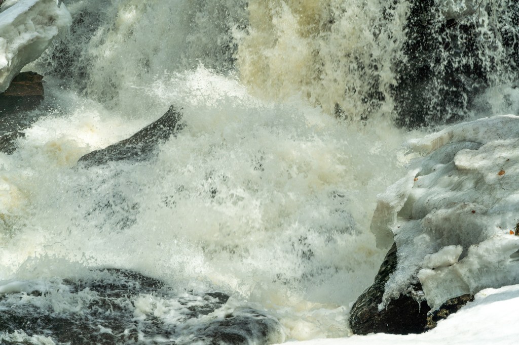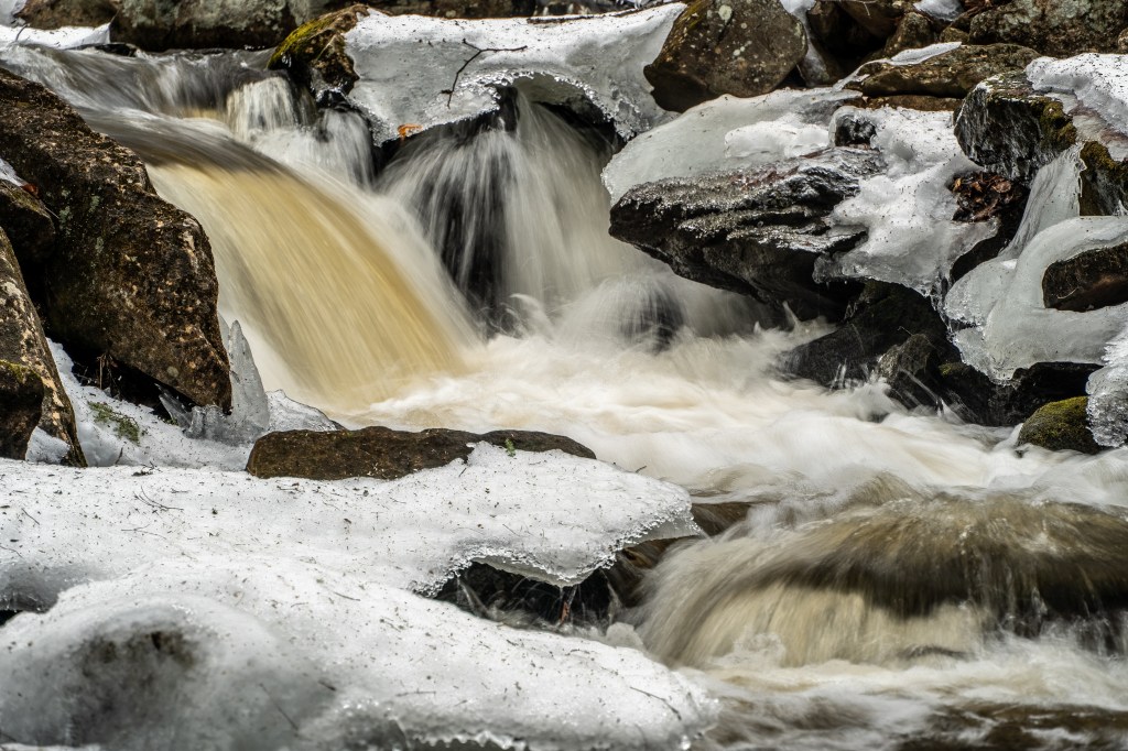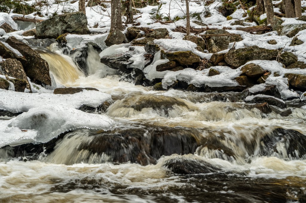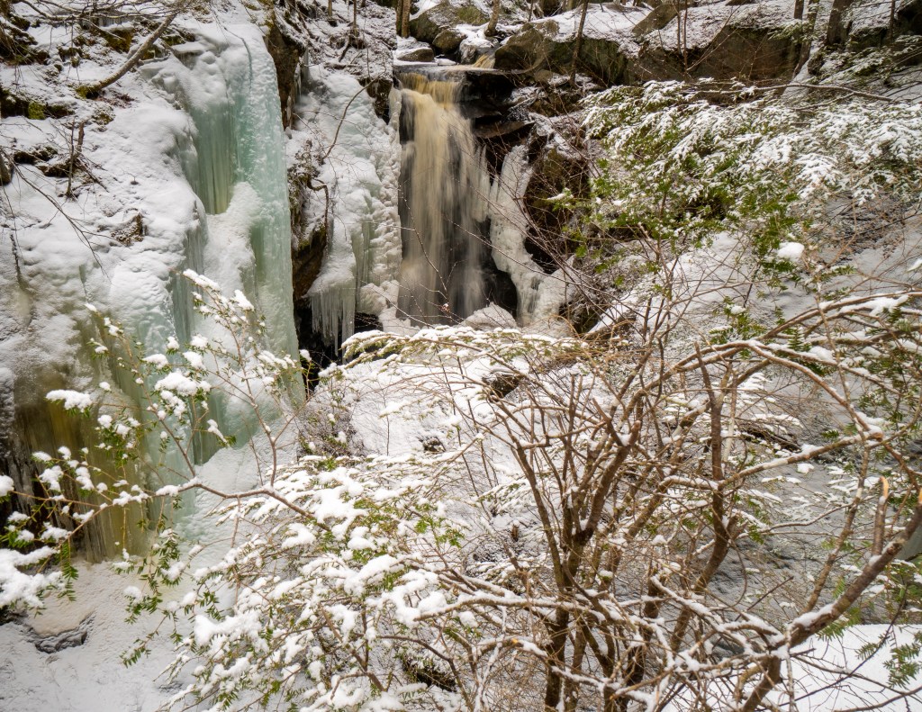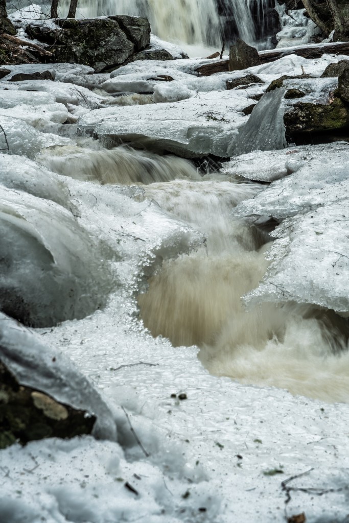 By early afternoon I was ready to sit down for some lunch, at about the time wife sent a text to express her regret at not having come with me. I assured her that I would be happy to wait where I was if she wanted to join me. We drove on up to Royalston Falls, about fifteen minutes further down the road, and only a short hike into the woods. I couldn’t get anything I liked of the falls themselves, because the near-certain death-danger of venturing past the wire rails to the icy precipices of the gorge didn’t seem a fair exchange for the photo I might get. Still, the geography around the gorge was full of moss covered boulders, trees with their roots splayed through fissures in the rocks, snow-frosted pines, and so on. This definitely is a place to revisit in other lights and weathers.